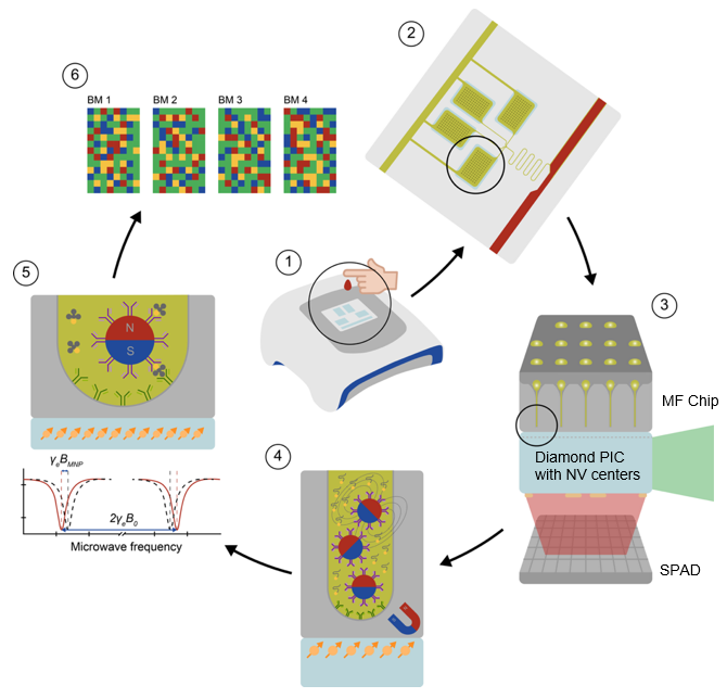 However, current NV sensing experiments rely on static droplets pipetted onto the diamond. These suffer from evaporation, lack reproducibility, and uncontrolled diffusion. There is no standardized "test bench" to dynamically vary biomarker concentrations. To bridge the gap to a practical Lab-on-Chip system, we need a detachable microfluidic cartridge that delivers fluid reliably and precisely controls flow, while maintaining the strict Z-standoff budget required for quantum detection.